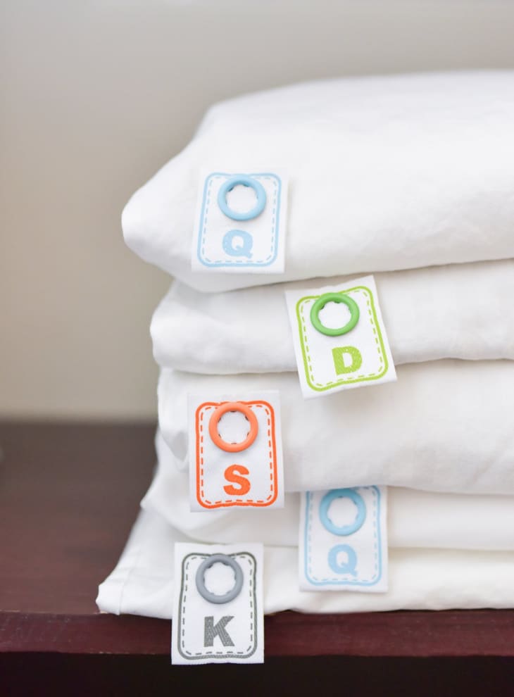 Cheat with your linen organisation. Don't label the shelf just label ... My simple Snap On Bedding Label indicates the size and orientation. *not recommended for thick sheets *not designed to be removed once installed, leaves a dent or may puncture the sheets depending on the thickness of the material. No sewing. No ironing. No need to remove before washing. Simply Snap On the Label to sheets & duvet covers.