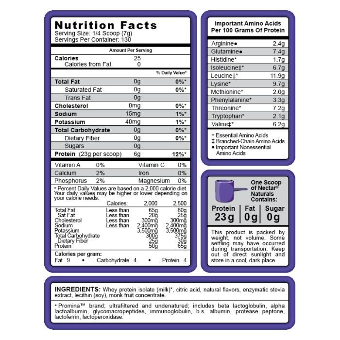 Syntrax® Nectar® Unflavored Medical Protein Powder - SI03 Syntrax® Nectar® Unflavored Medical Protein Powder Nectar® Medical is a 100% natural protein formula designed to exceed even the most stringent and demanding requirements of the medical community. It is designed around Promina, a superior-quality whey protein isolate that is known for its utmost purity, unwavering consistency and pleasant taste. Syntrax® Nectar® - High Quality, Great Tasting Whey Protein Isolate A serving of Nectar® is 1/4 scoop and should be mixed with 2-4 oz of water, depending on taste preferences. One full scoop, which provides 23 g of protein, 0 g of fat and 0 g of sugar, may be mixed with 8-16 oz of water. Nectar® Lattes and Nectar® Sweets also taste great in milk. If mixing in milk, please note the extra calories. Amazon.com: Syntrax Nectar Naturals, Native Grass-Fed Whey Protein ... Syntrax Nectar, Native Grass-Fed Whey Protein Isolate, Refreshing Fruit Flavor, Mixes Instantly, RBTS, Lactose & Gluten Free, Caribbean Cooler, 2 lb 56 2 offers from $57.16 Syntrax Nectar Sweets, Native Grass-Fed Whey Protein Isolate, Mixes Instantly, Vanilla Bean Torte, 32 Ounce 824 3 offers from $41.50 All Syntrax Nectar Flavors - Best Price Nutrition Try Syntrax Nectar Refreshing Fruity Flavors Today! Featuring Promina Pharmaceutical Grade Cold Filtered Whey Protein Isolate! Best Tasting Whey Protein on the Market! Syntrax Nectar Whey Protein Isolate Benefits Promina, Pharmaceutical Grade WPI 23g Protein Per Serving Cold Filtered WPI Amazing Fruity Flavors Aspartame Free