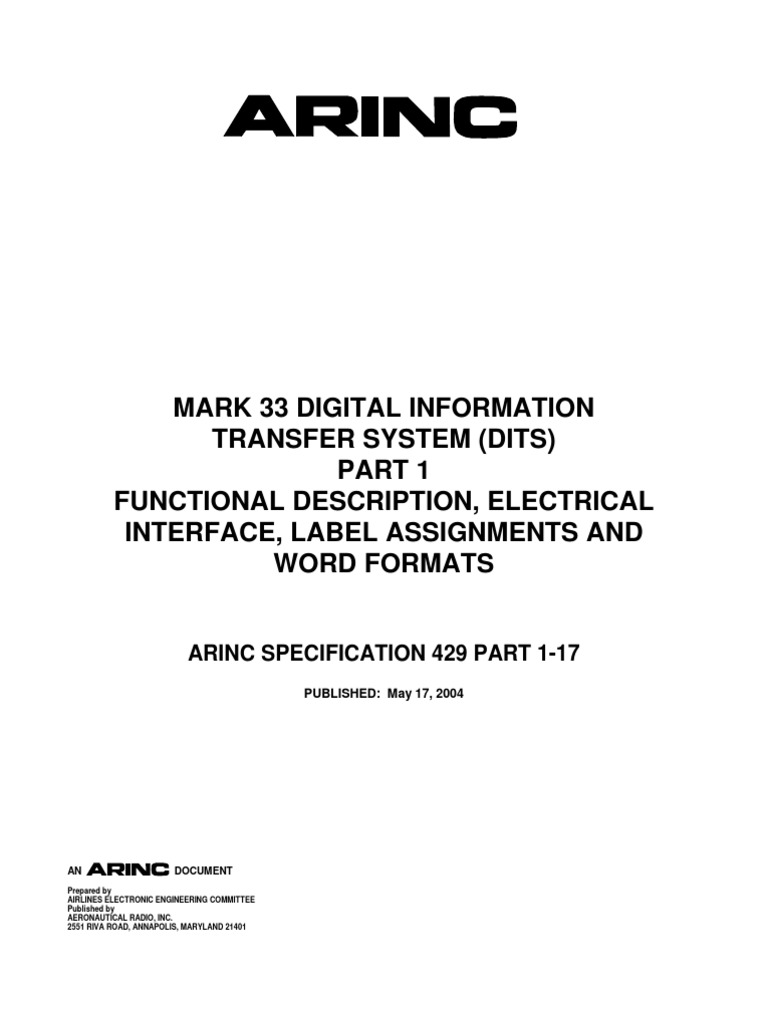 PDF LeCroy ARINC 429 and Symbolic Decode Datasheet ARINC 429 DSymbolic option decodes ARINC 429 serial data into symbolic (Application layer) text directly on the oscilloscope display. The user defined file converts the decoded hex, binary, hexadecimal, or decimal values into a label defined by the ARINC 429 system. The Single Tool Enhances Productivity PDF MARK 33 DIGITAL INFORMATION TRANSFER SYSTEM (DITS ... - toddheffley.com ARINC 429 Part 1, Table 2, BNR Data (Label 335 reproduced in part). Changes are shaded in yellow. ARINC Specification 429 Part 1-17 REVISED Label Eqpt ID (HEX) Parameter Name Units ... 3.1.1 Word Format and Digital Language 11 3.1.2 Update Rate 11 3.1.3 Sign/Status Matrix 11 3.1.4 Frequency Ranges and Switching Functions 11 ...