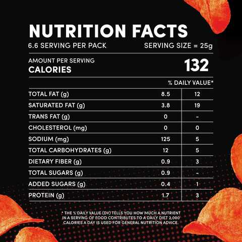 Lay's Potato Chips, Classic Nutrition Facts & Calories NUTRITION LABEL (% of daily value based on 2000 calories per day) Nutrition Facts. Lay's Potato Chips, Classic. Serving Size: Serving (8g) * Amount Per Serving ; Calories: cal : Calories from Fat: 0 cal % Daily Value : Total Fat: g % Saturated Fat : g % Cholesterol: mg % Sodium: