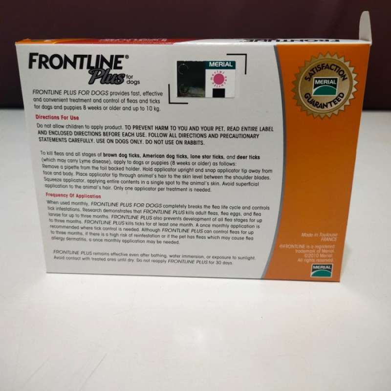 Frontline Plus for Dogs | Frontline It's easy to apply FRONTLINE PLUS to your dog 01 02 03 04 Step 4 Apply entire contents in one spot. See the product label for full instructions. Step 1 Hold the pipette upright with the label facing towards you. Tapping the neck of the pipette can help ensure the contents are in the main body of the pipette. Snap off the tip along the scored line.