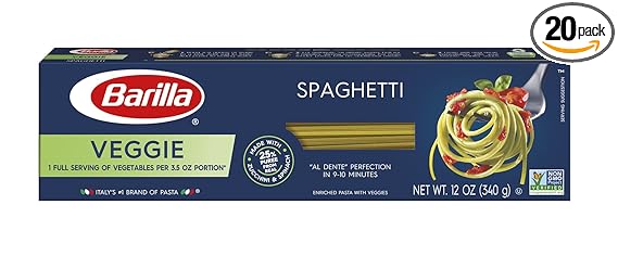 Barilla Veggie Pasta, Spaghetti Pasta, 12 Ounces (Pack of 20) Serving Size: Six 2 ounce servings of vegetable spaghetti pasta per box 3.5 oz. of vegetable spaghetti provides 20% of the daily recommended amount of veggies for your diet Barilla's vegetable pasta is non-GMO verified, kosher certified, product of USA, and tastes great Virtual experiences for $15 or less Amazon Explore Browse now