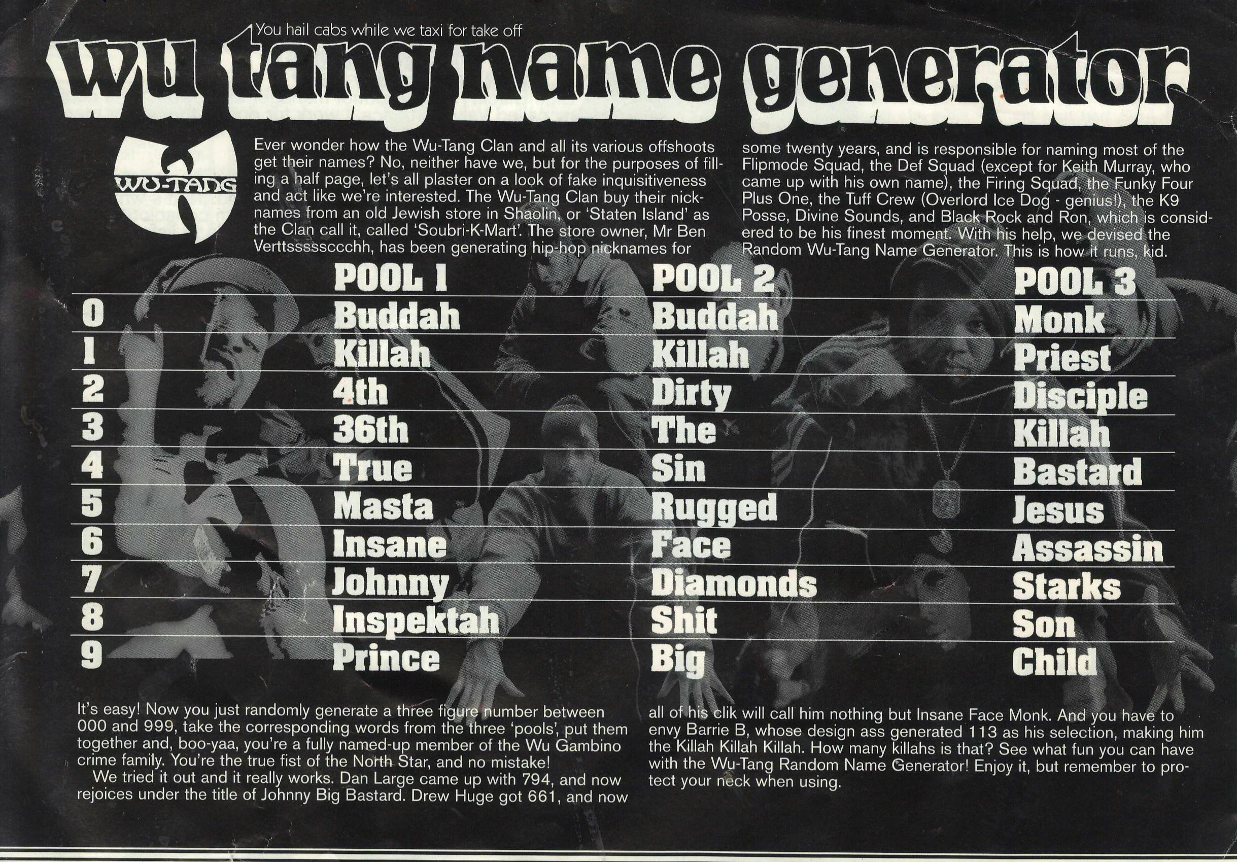 25 Best Free Rap Name Generators to Get Ideas in Minutes! - Hip Hop Makers The tool generates one name at a time. There is also a second Wu-Tang Clan name generator. 4. Cool Rap Name Generator. The Cool Generator has collected more than 13,000 rap names. Once you enter your name, it will generate ideas for you. The website can provide up to 48 name ideas at once. 5. Lil Rap Name Generator.