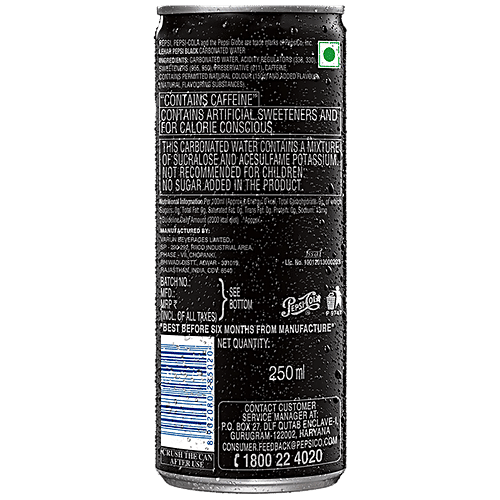 Pepsi Diet - Ingredients & Nutritional Information Carbonated Water, Colour (Caramel E150d), Acids (Phosphoric Acid, Citric Acid), Flavourings (including Caffeine), Sweeteners (Aspartame, Acesulfame K), Acidity Regulator (Sodium Citrate), Preservative (Potassium Sorbate). Contains A Source Of Phenylalanine. SIZES Nutritional Information 330ml can = 1 serving PEPSI MAX RASPBERRY Pepsi.com Pepsi. Nutrition Facts. Serving Size 12 fl oz (355 mL) Servings Per Container 1. Amount Per Serving. Calories 250. % Daily Value *. Total Fat 0 g. 0 %.