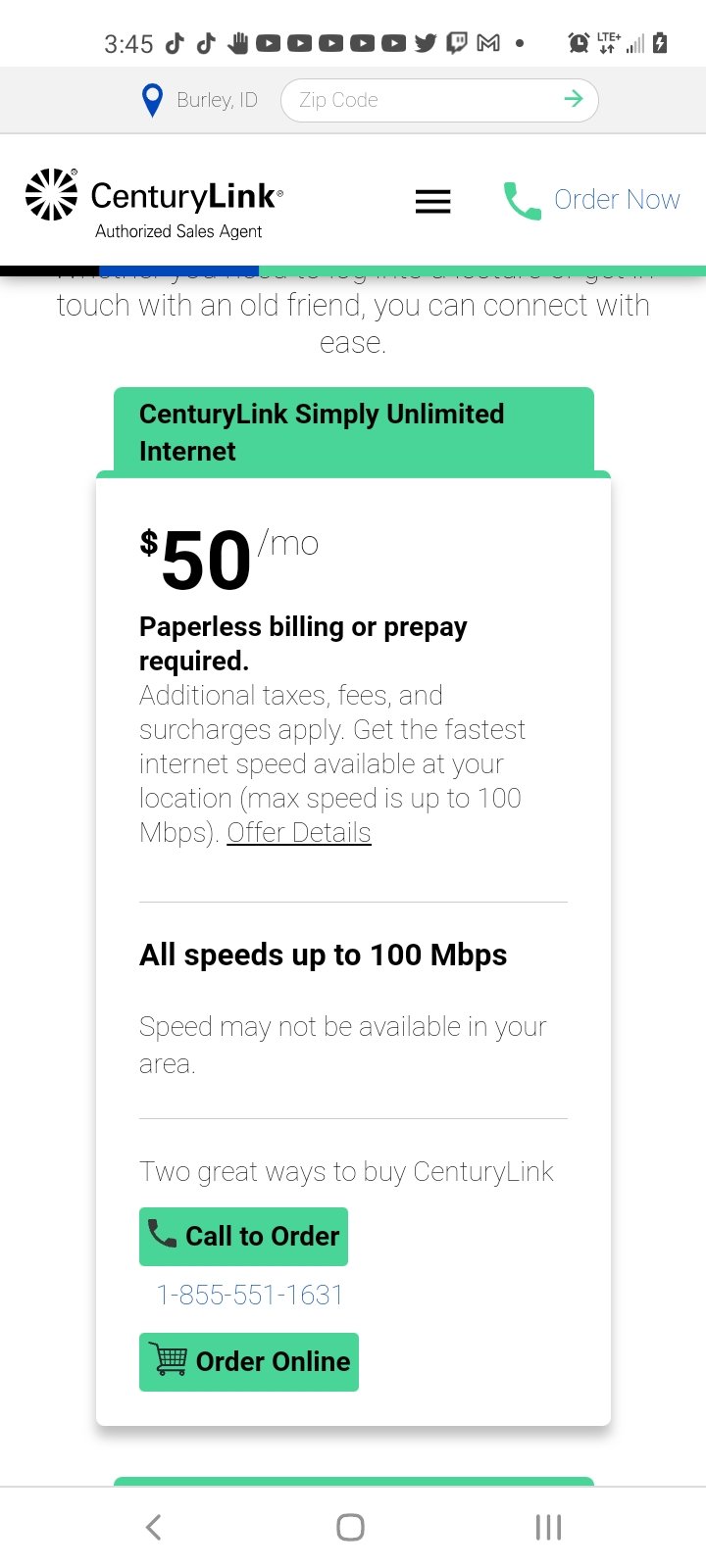 CenturyLink Internet Plans, Prices, & Deals All speeds up to 100 Mbps. (Speed may not be available in your area.) $ 50 /mo. Unlimited. Uncomplicated. Unbundled. Paperless billing required. Taxes and fees apply. Get the fastest internet speed available at your location (max speed is up to 100 Mbps).