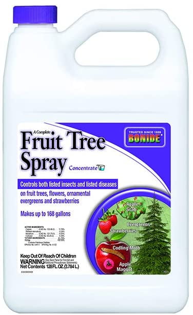 Bonide Fruit Tree Spray Concentrate, 16 oz - amazon.com 16 oz., Liquid Concentrate, Fruit Tree Spray. Formula is an excellent product for the home orchardist. Controls both insects, and diseases on fruit trees, flowers, evergreens, and strawberries. Only need as little as 1-1/2 tablespoons per application. Contains Captan 12%, Malathion 6%, Carbaryl .3%., and spreader sticker.