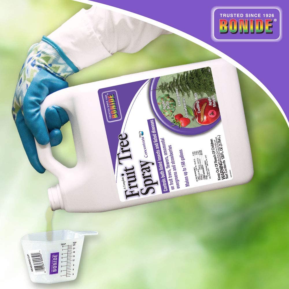 Bonide (BND205) Fruit Tree Concentrated Spray, 128 oz Bonide Fruit Tree Spray is an excellent concentrate that contains an insecticide, fungicide, aphicide, miticide, scalicide, and a spreader sticker. It controls a diverse selection of insects including Japanese beetles, mites, flea beetles, aphids plus more.