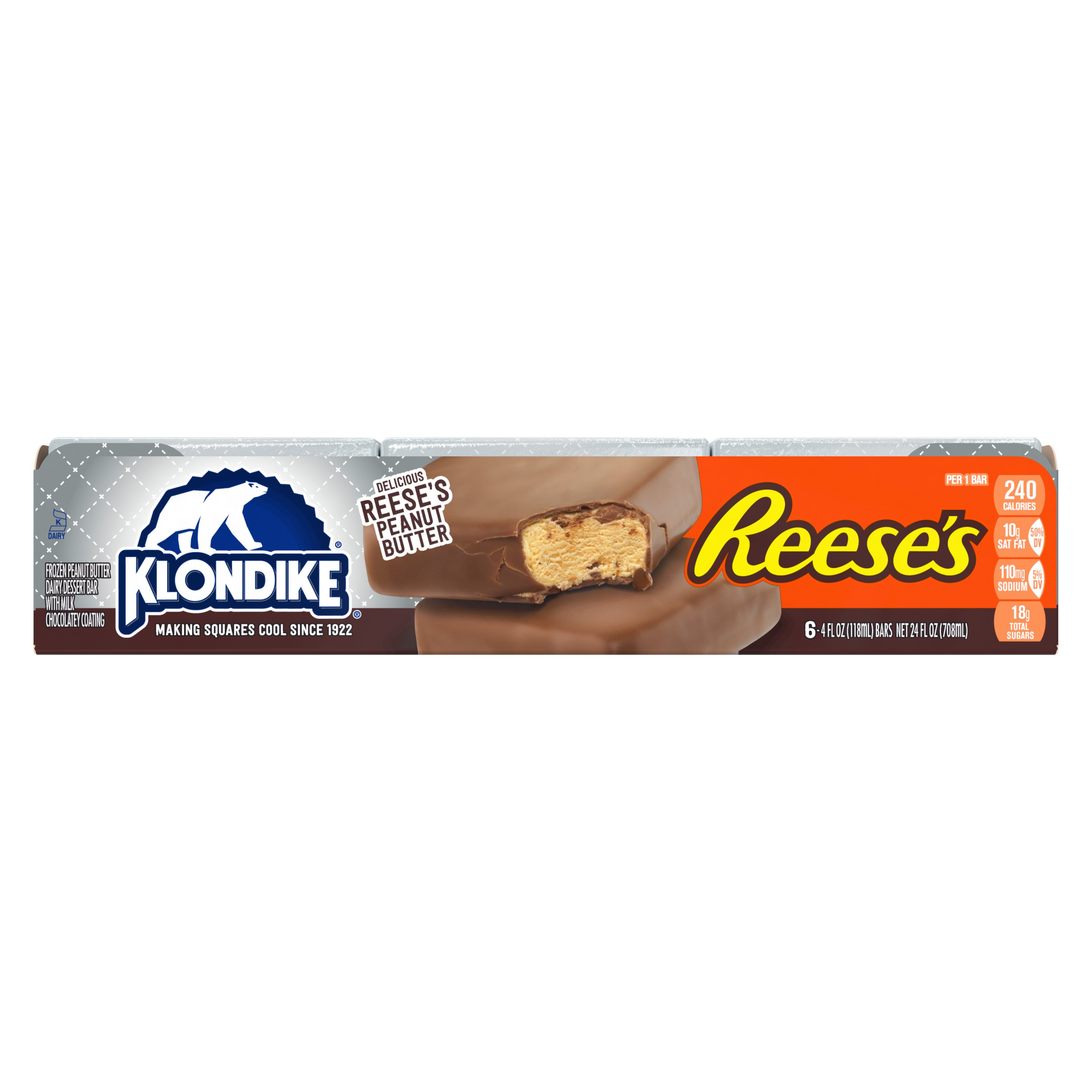 Klondike Frozen Vanilla Dairy Dessert Bars Original No Sugar Added 4 fl ... Our Klondike No Sugar Added Dessert Bar includes all the same great taste as our original without the sugar; ... No, 40% less fat, 25% less calories, No sugar added, Kosher. Capacity. 6 - 4 fl oz (118 ml) bars [24 fl oz (708 ml)] Food Form. Bars. Container Type. Wrapped, Box. Model. 01120. Retail Packaging. Pack.
