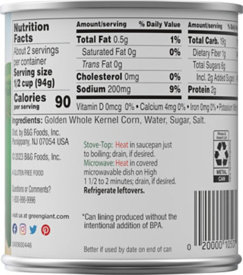 Green Giant® Whole Kernel Sweet Corn 15.25 oz. Canned Vegetables; Frozen Vegetables - Boxes ... Green Giant® SteamCrisp® Whole Golden Corn Niblets No Salt Added 11 oz. Can; Explore More. Green Giant® No Salt Added Whole Kernel Sweet... Green Giant® SteamCrisp® Super Sweet White Whole... Green Giant® 50% Less Sodium Whole Kernel Sweet... New Products. Corn, sweet, yellow, canned, whole kernel, drained solids [Includes ... Corn, sweet, yellow, canned, whole kernel, drained solids [Includes USDA commodity food A119] Serving size: 100 grams 1 ounce (28g)1 cup (164g)1 can (12 oz) yields (211g)1 can (303 x 406)... Serving Size Updates on the New Nutrition Facts Label | FDA On the original Nutrition Facts label, the serving size was 1/2 cup (66g), while on the new Nutrition Facts label, the serving size is 2/3 cup (88g). While it may look like the calories and ... Kroger® Sweet Whole Kernel Canned Golden Corn Whole Kernel Corn is picked at the peak of ripeness and packed within hours to seal in the U.S.A. Made with fresh, 100% Sweet Corn for a naturally sweet flavor, bright golden yellow color; No Preservatives; Only corn, water, sugar and salt; Cultivated in the U.S. heartland by multi-generational, U.S. farmers on family-owned farms