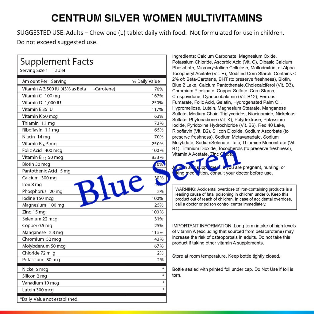 Centrum Silver Women 50+ Multivitamin / Multimineral Dietary ... One 200 count bottle of Centrum Silver Women's Multivitamin Supplement for Women 50 Plus. Leading vitamins for women clinically shown to support cognitive health in older adults (1) Contain micronutrients such as B Vitamins, Vitamin D3 and Zinc. Help support immune health, bone health and muscle function with vitamin D (1) Centrum Silver Women by AP Serving — Centrum Silver Women. Multivitamin/Multimineral Supplement. This is the most current labeling information and may differ from labels on product packaging.2 pages Centrum Silver: Indications, Side Effects, Warnings - Drugs.com Jul 9, 2022 · Warning. If your product has iron in it: Accidental overdose of drugs that have iron in them is a leading cause of deadly poisoning in children younger than 6 years of age. Keep away from children. If Centrum Silver (vitamins (multiple/oral)) is taken by accident, call a doctor or poison control center right away. Centrum Silver Women 50+ Multivitamin Multimineral 250 Tabs Oct 19, 2006 · With Centrum's highest levels of D3, Centrum Silver Women multivitamins are age-adjusted to help support the health of women 50+. It supports heart, brain, eyes and bone health. Backed by over 30 years of nutritional science expertise, Centrum is the #1 doctor- and pharmacist-recommended multivitamin brand.